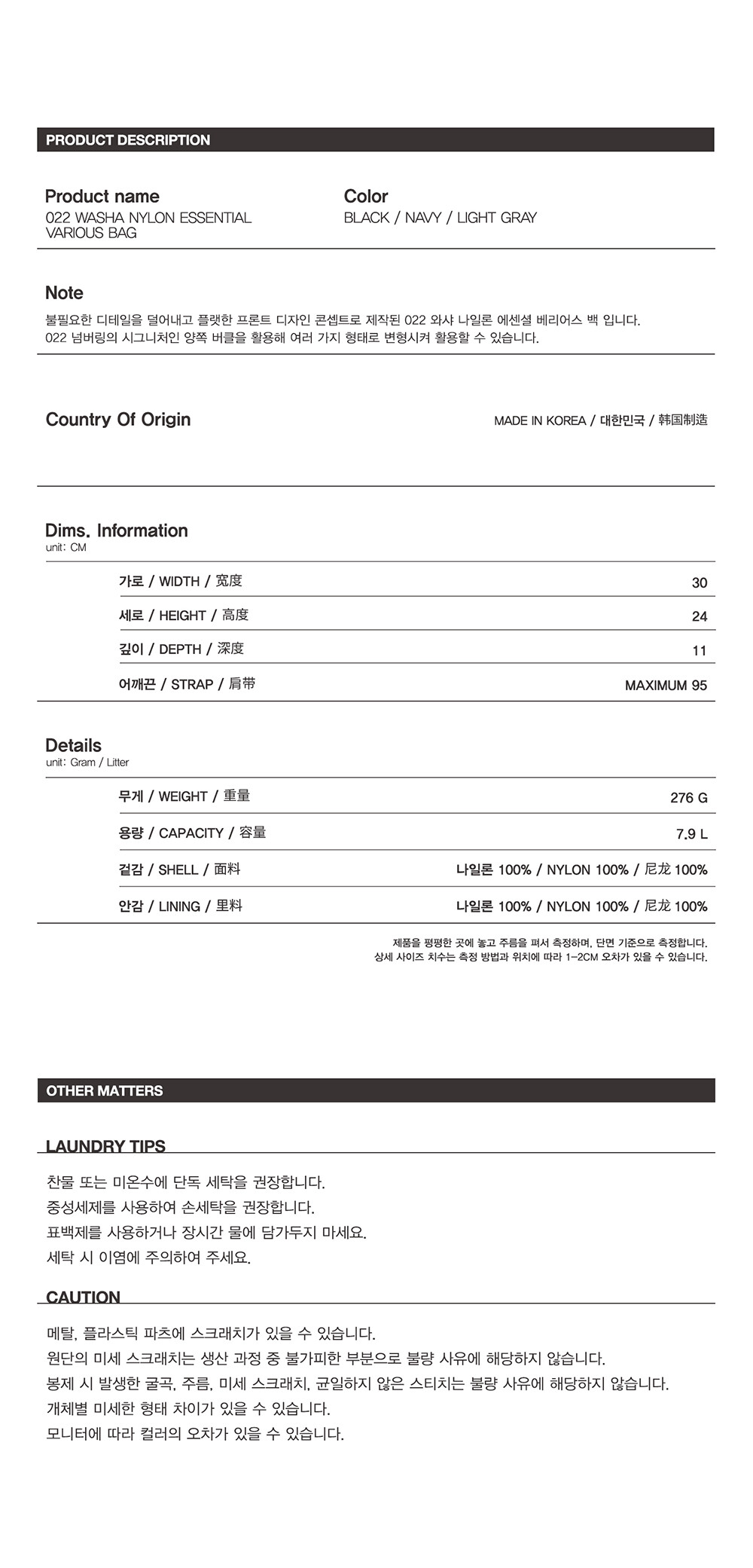 022 WASHA NYLON ESSENTIAL VARIAOUS BAG-NAVY