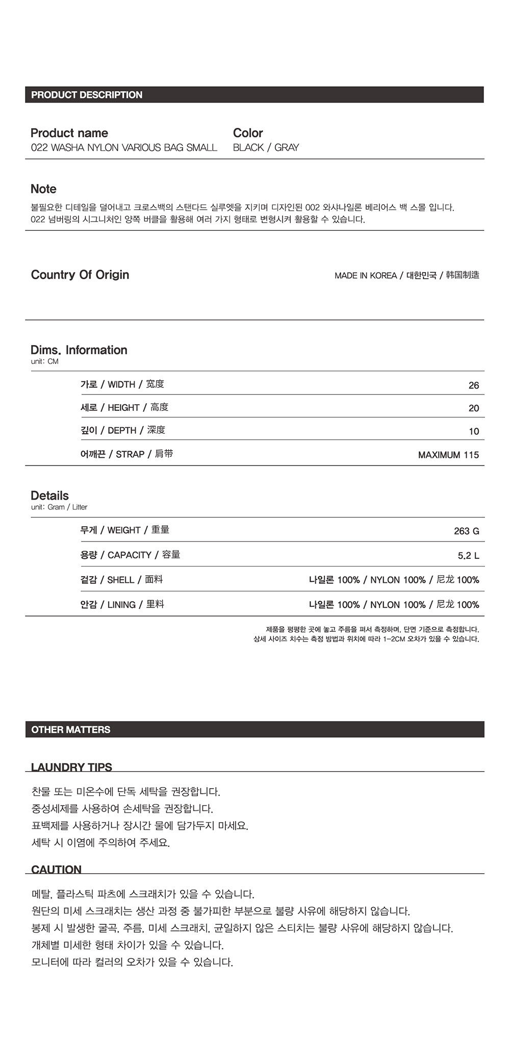 022 WASHA NYLON VARIAOUS BAG SMALL-BLACK