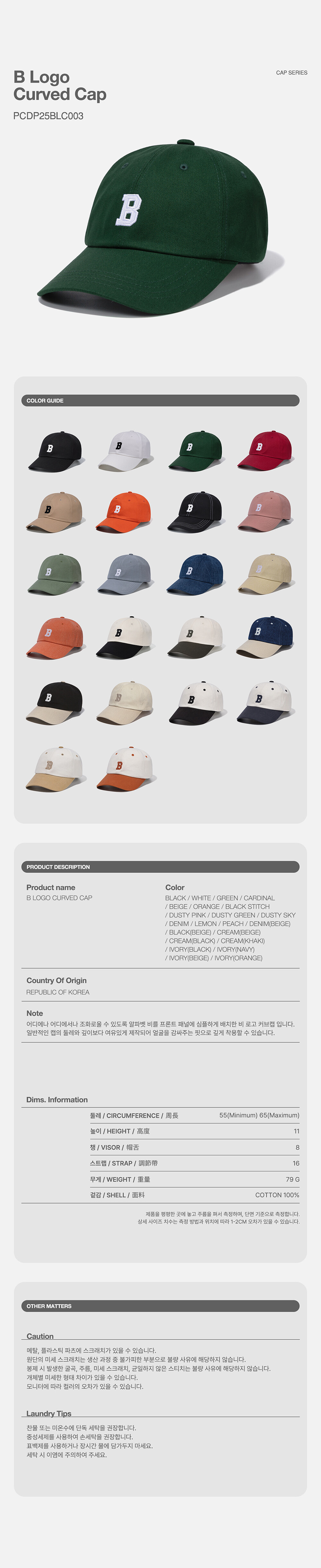 · 볼 캡의 챙은 얼굴을 감싸주는 형태를 연출하기 위해 8센치 챙을 사용했습니다. 후면의 스트랩으로 둘레 길이를 본인의 두상에 맞게 조절하여 착용할 수 있습니다.