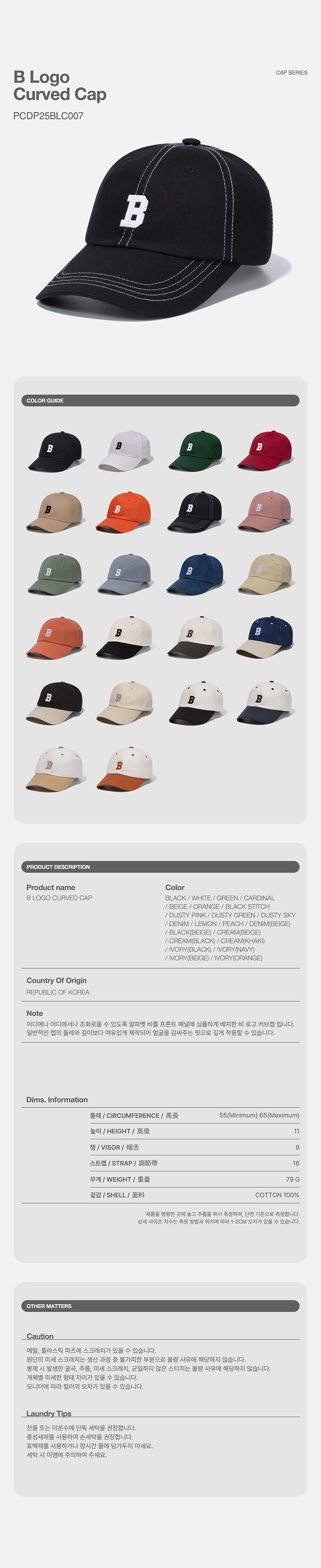 · 볼 캡의 챙은 얼굴을 감싸주는 형태를 연출하기 위해 8센치 챙을 사용했습니다. 후면의 스트랩으로 둘레 길이를 본인의 두상에 맞게 조절하여 착용할 수 있습니다.