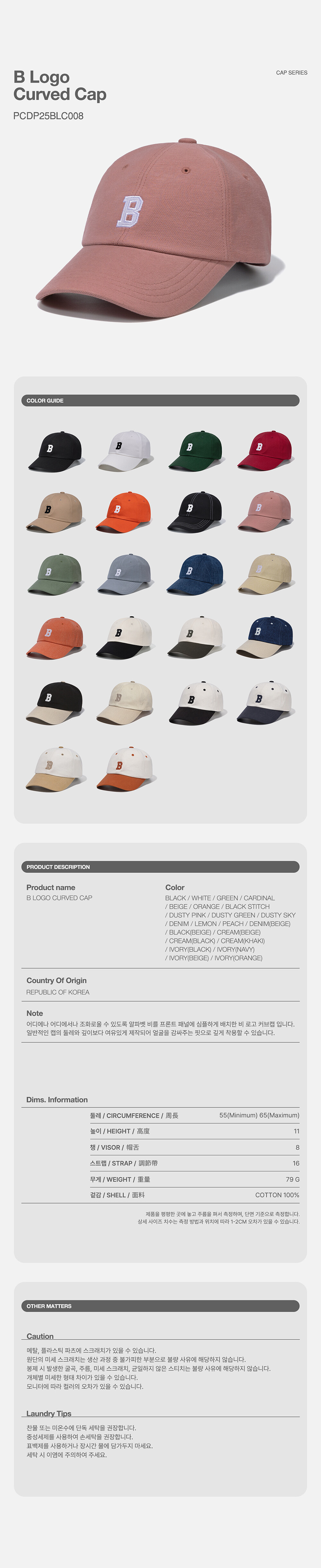 · 볼 캡의 챙은 얼굴을 감싸주는 형태를 연출하기 위해 8센치 챙을 사용했습니다. 후면의 스트랩으로 둘레 길이를 본인의 두상에 맞게 조절하여 착용할 수 있습니다.